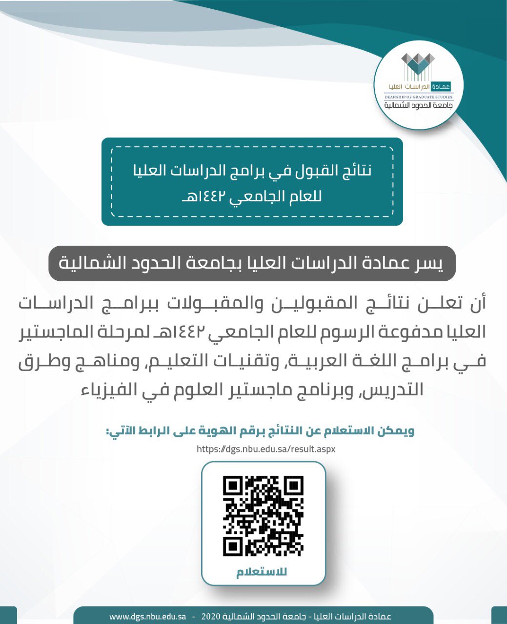 جامعة الحدود الشمالية On Twitter عمادة الدراسات العليا بالجامعة تعلن نتائج المقبولين والمقبولات ببرامج الدراسات العليا للعام الجامعي 1442هـ لمرحلة الماجستير في عدد من التخصصات للاستعلام عن النتيجة يرجى الضغط على الرابط